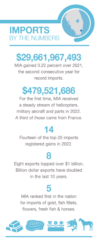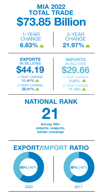 Miami International Airport (MIA) TradeNumbers 2023 Pamphlet is available as both printed and digital download versions. This annual publication is a pocket-guide summary full of insights into MIA Airport’s trade with the world with 2022 trade data figures as analyzed by WorldCity using U.S. Census Bureau trade data.