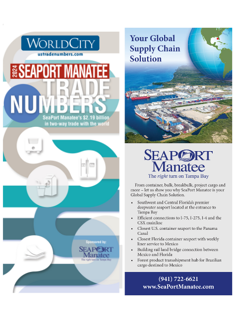 SeaPort Manatee TradeNumbers 2024 Pamphlet is available as both printed and digital download versions. This annual publication is a pocket-guide summary full of insights into Seaport Manatee’s trade with the world with 2023 trade data figures as analyzed by WorldCity using U.S. Census Bureau trade data.